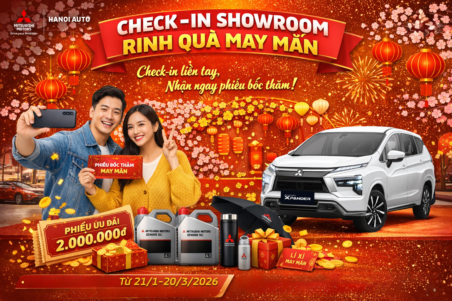 Nhằm tri ân sự tin tưởng và đồng hành của Quý khách hàng trong suốt thời gian qua, đặc biệt trong dịp năm mới 2026, Mitsubishi Cầu Diễn (Hanoi Auto) triển khai chương trình “Check-in Showroom nhận phiếu bốc thăm may mắn” dành cho tất cả khách hàng đến Showroom xem xe hoặc làm dịch vụ.