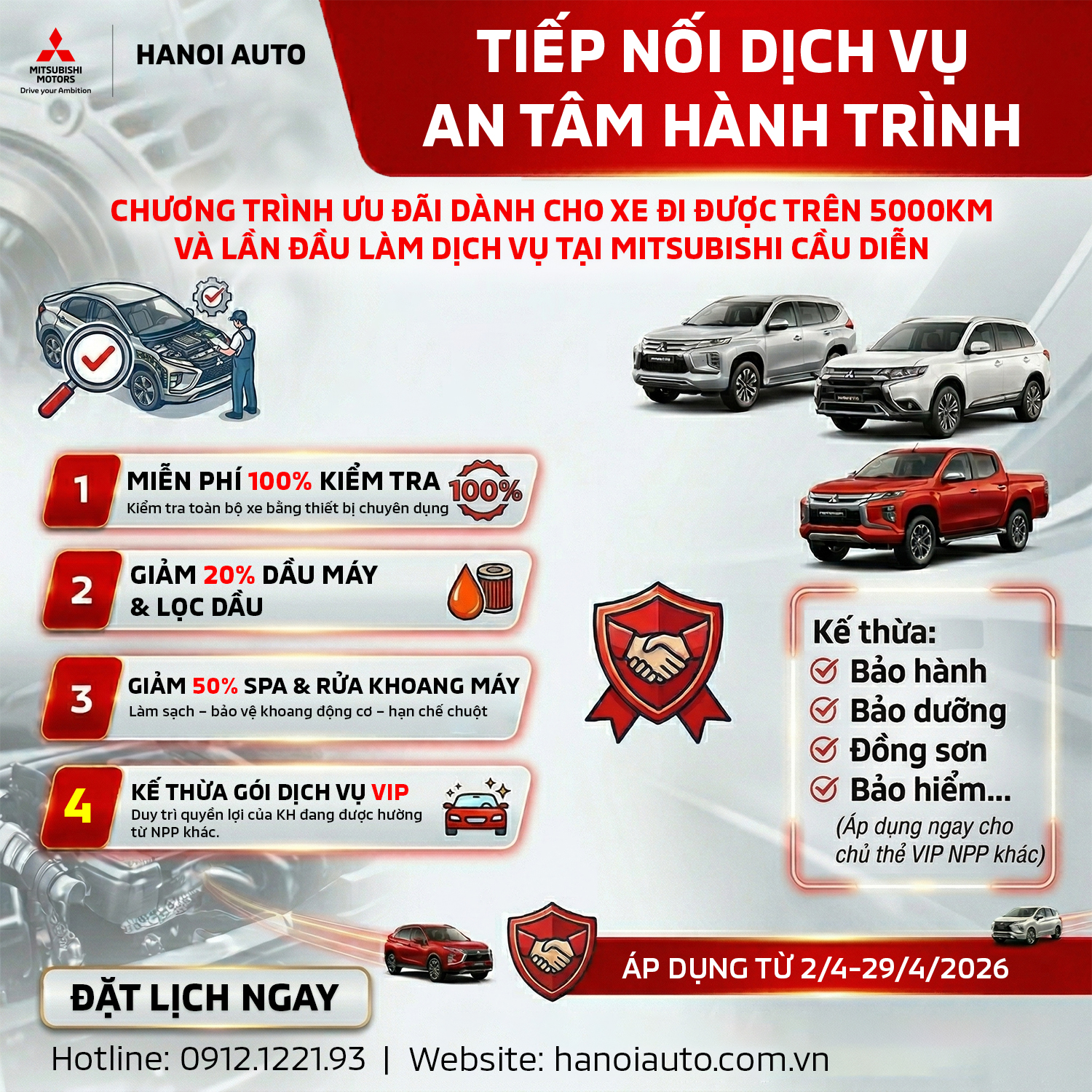Nhằm mang đến sự thuận tiện và an tâm tối đa cho khách hàng trong quá trình chăm sóc xe, Mitsubishi Cầu Diễn triển khai chương trình ưu đãi đặc biệt dành cho xe đi được trên 5000km và lần đầu làm dịch vụ tại Mitsubishi Cầu Diễn (Hanoi Auto).