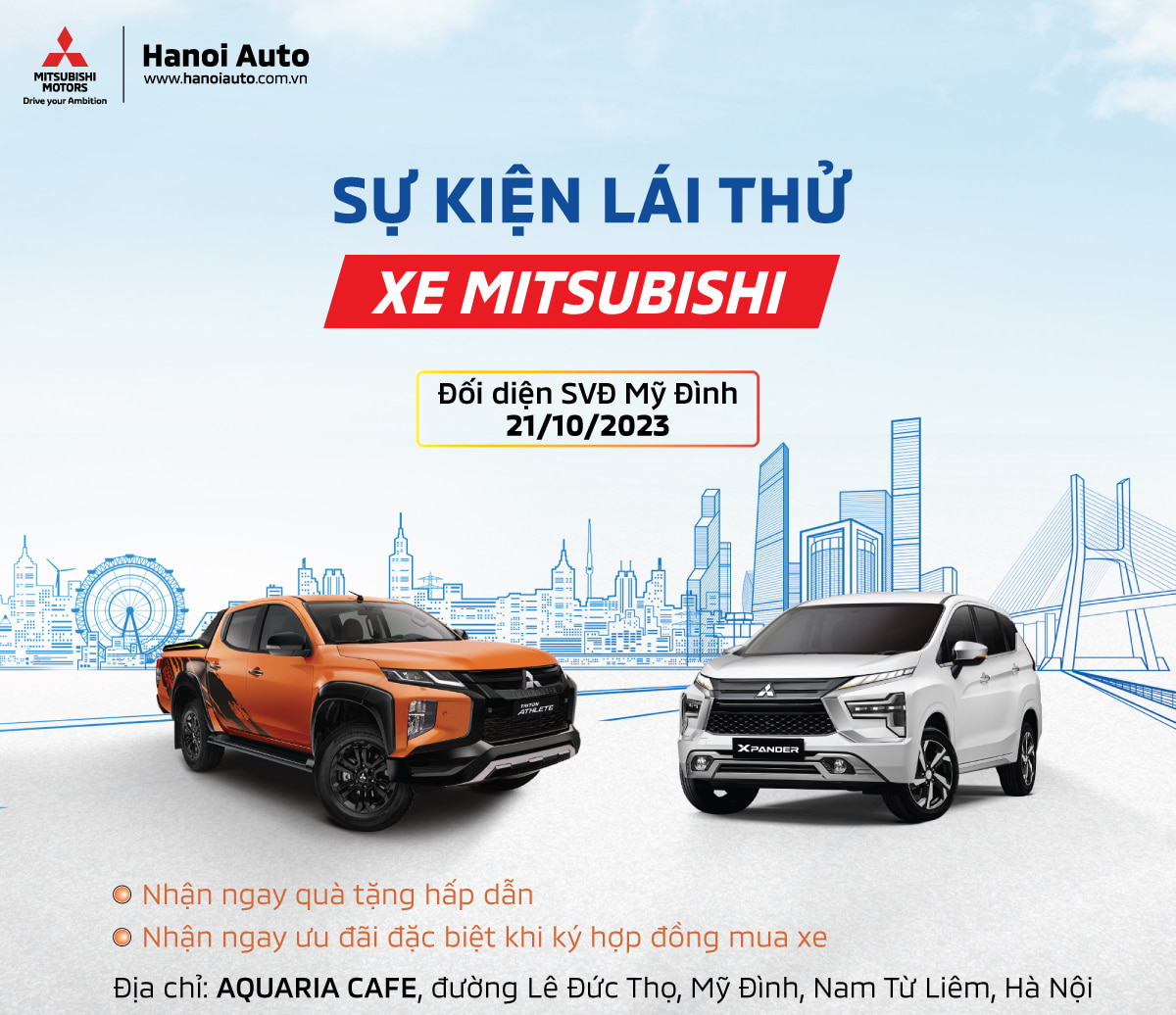 Tháng 10/2023 này Mitsubishi Cầu Diễn (Hanoi Auto) tổ chức chương trình “Trưng bày và lái thử xe Mitsubishi” ngay tại Sân vận động Mỹ Đình. Đặc biệt tại sự kiện này chúng tôi giới thiệu đến Quý khách hàng những mẫu xe hoàn toàn mới vừa được ra mắt tại Việt Nam để Quý khách trải nghiệm và lái thử. Ngoài ra, Quý khách hàng ký hợp đồng mua xe tại sự kiện này sẽ nhận được nhiều ưu đãi đặc biệt từ nhà phân phối Hanoi Auto.