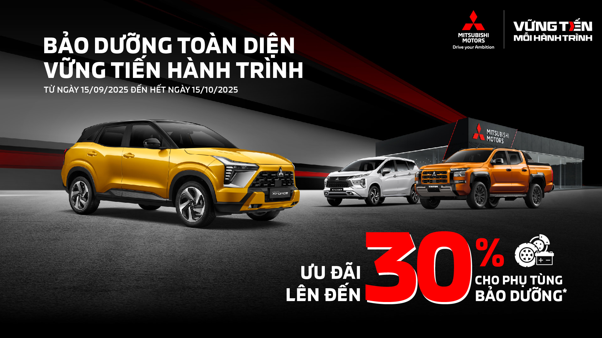 Chương trình áp dụng cho tất cả các xe Mitsubishi đến bảo dưỡng/ sửa chữa thay thế phụ tùng tại hệ thống của Mitsubishi Cầu Diễn trên toàn quốc. thời gian từ 15/09/2025 đến 15/10/2025.